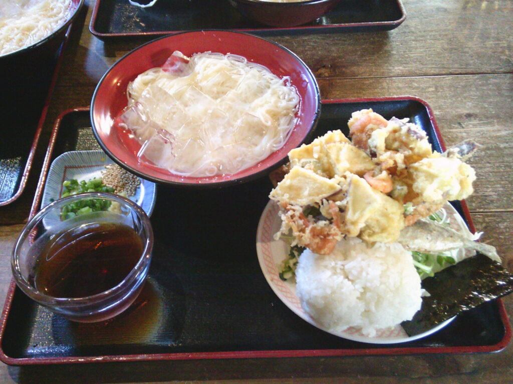 そうめんはコシがあって食べ応えがあり天ぷらはサクサクで美味しかったです😋