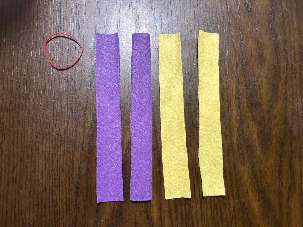 1、まず細長く切ったフェルトを4つとも重ね、一番上を輪ゴムで止めます