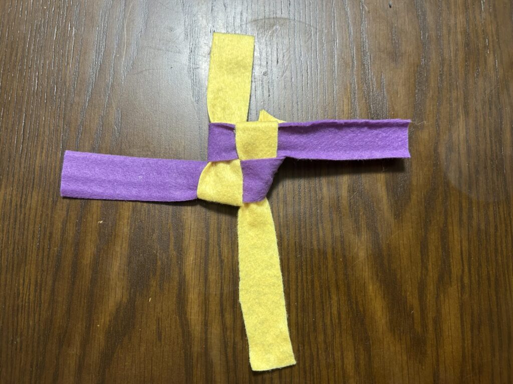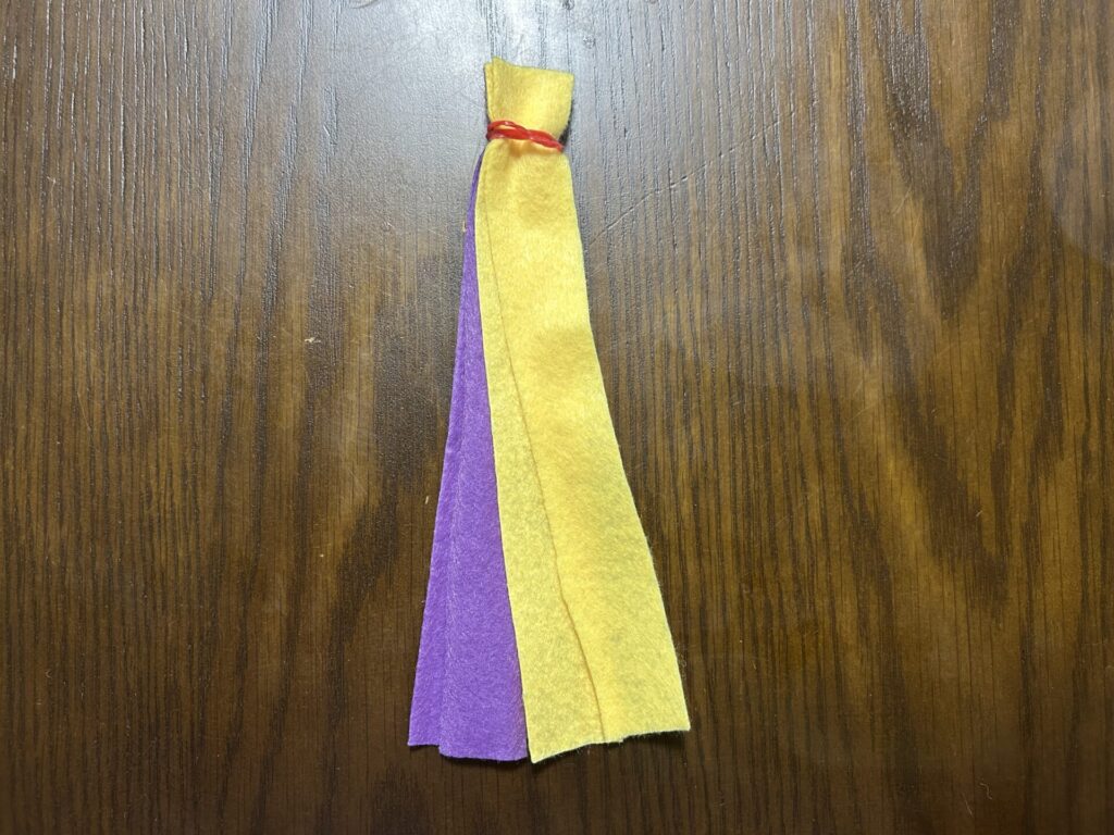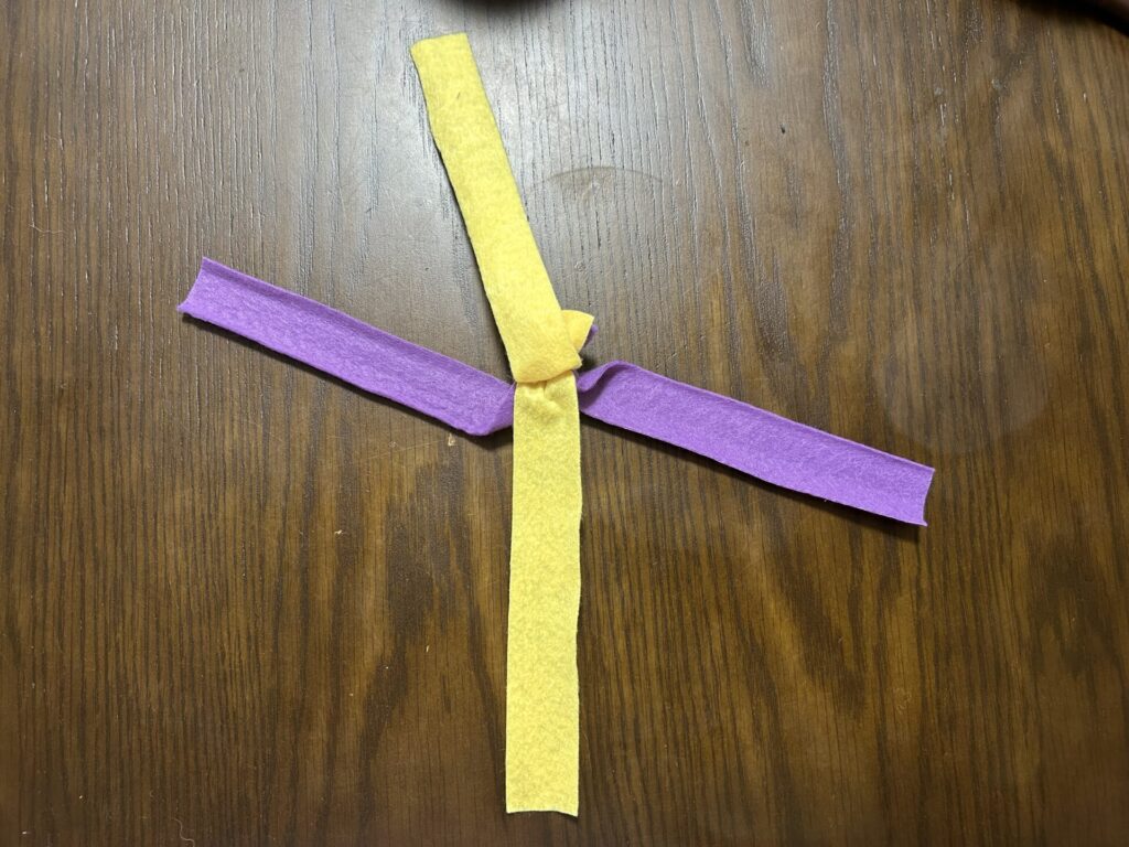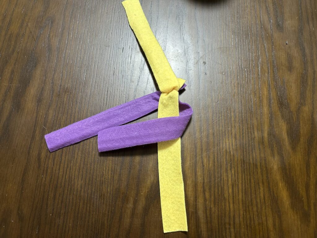 4、最後の4本目のフェルトには一番始めのフェルトがかかっているので、この最初のフェルトの下に通します