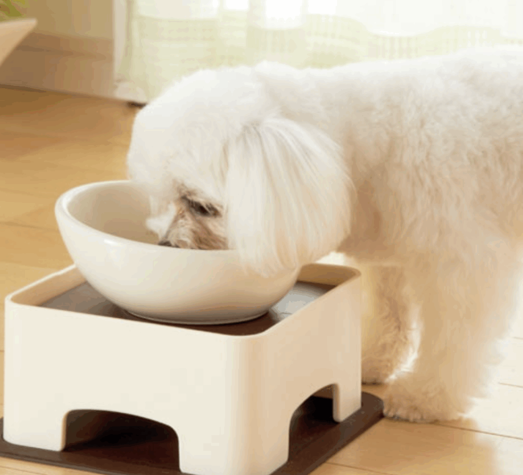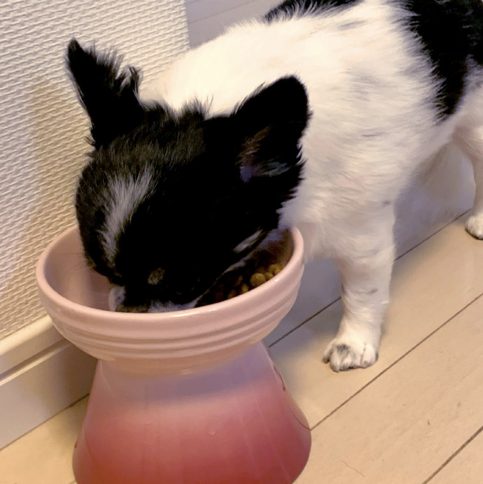 食器を台の上に置いたり、底が長いものを使用することで、首を曲げずに食べることができます。