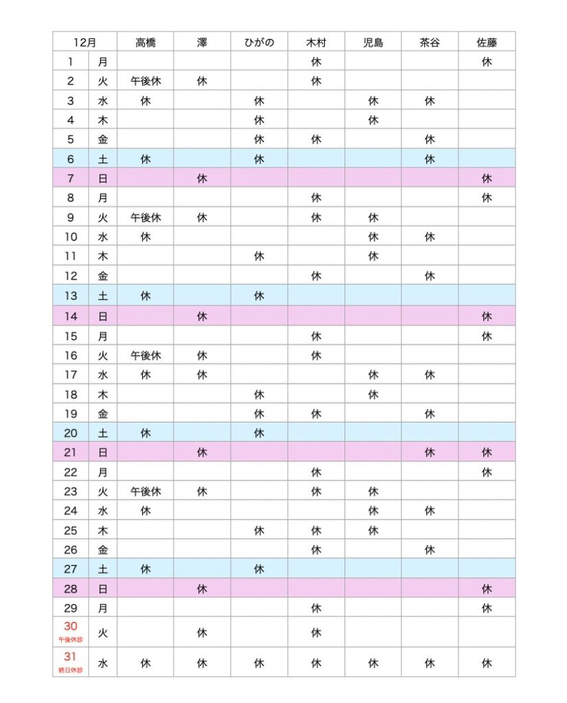 12月の当院獣医師勤務表は下記のとおりです。