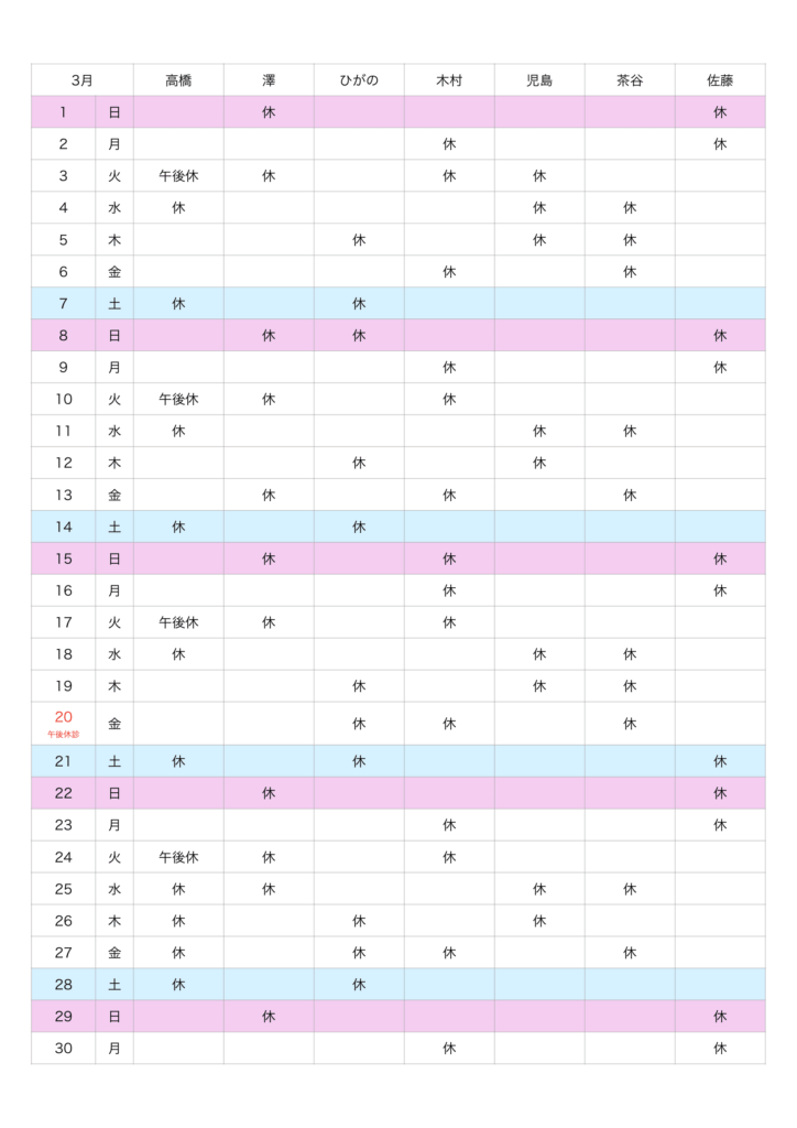 3月の当院獣医師勤務表は下記のとおりです。